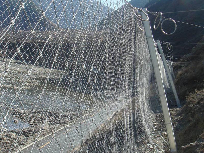 4、被動(dòng)防護(hù)網(wǎng)系統(tǒng)由鋼絲繩網(wǎng)或環(huán)形網(wǎng)(需攔截小塊落石時(shí)附加一層鐵絲格柵)、固定系統(tǒng)(錨桿、攔錨繩、基座和支撐繩)、減壓環(huán)和鋼柱四個(gè)主要部分構(gòu)成,被動(dòng)防護(hù)網(wǎng)的柔性主要來(lái)自于鋼絲繩網(wǎng)、支撐繩和減壓環(huán)等結(jié)構(gòu),且鋼柱 與基座間亦采用可動(dòng)鉸聯(lián)結(jié)以確保整個(gè)系統(tǒng)的柔性匹配被動(dòng)防護(hù)網(wǎng)是采用鋼絲繩錨桿或鋼筋錨桿和支撐繩固定方法將金屬柔性網(wǎng)覆蓋在具有潛在地質(zhì)災(zāi)害的坡面上,從 而實(shí)現(xiàn)坡面加固或限制落石運(yùn)動(dòng)范圍的一種防護(hù)網(wǎng)。