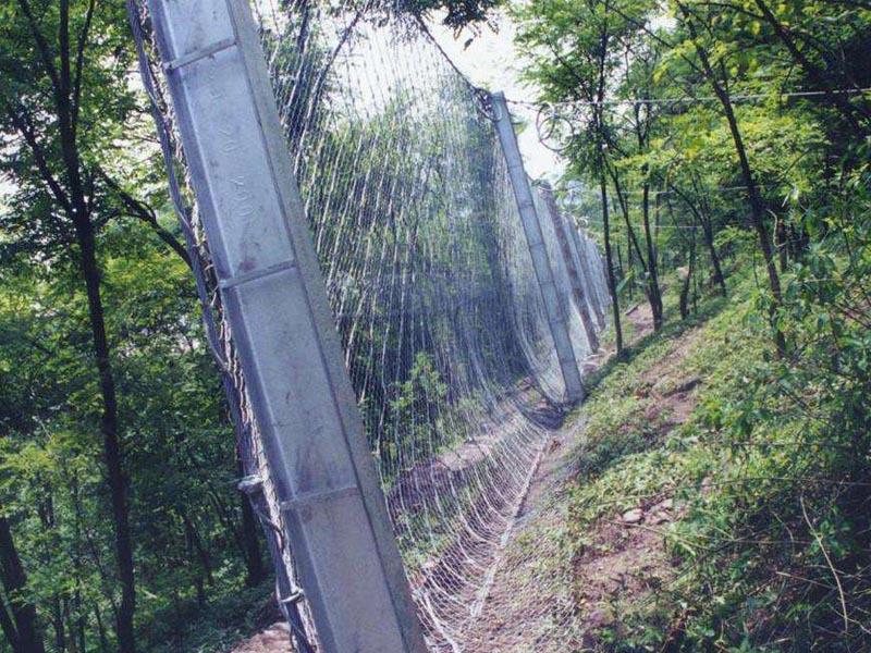 被動(dòng)防護(hù)網(wǎng)是將以鋼絲繩網(wǎng)為主的柵欄式柔性欄石網(wǎng)設(shè)置于斜坡上相應(yīng)位置,用于攔截斜面坡上的滾落石以避免其破壞保護(hù)的對(duì)象,因皮有時(shí)也稱為攔石網(wǎng);當(dāng)設(shè)置于泥石流區(qū)域時(shí),被動(dòng)防護(hù)網(wǎng)便可形成攔截泥石流體內(nèi)固體大顆粒的柔性格柵壩。