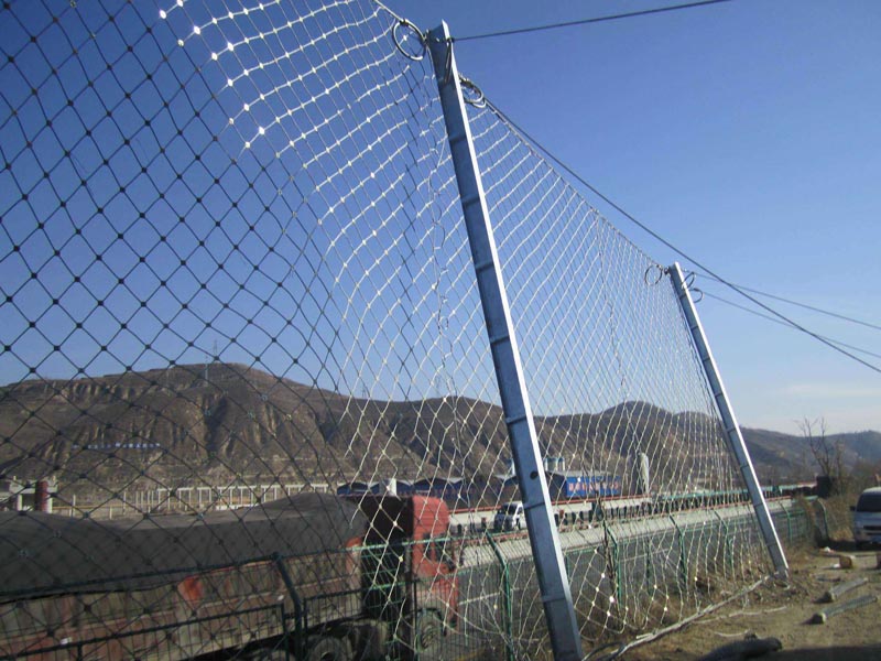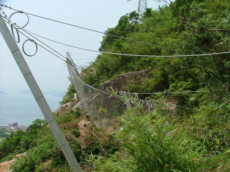 主體構(gòu)造:[鋼柱(間距10M),帶消能環(huán)的∮18雙支撐繩和∮16“人”字形上拉錨繩(每跨10個消能環(huán)),∮18側(cè)拉錨繩(單繩),◇/08/150/4*5㎡鋼絲繩網(wǎng),∮8縫合繩,格柵網(wǎng)]
